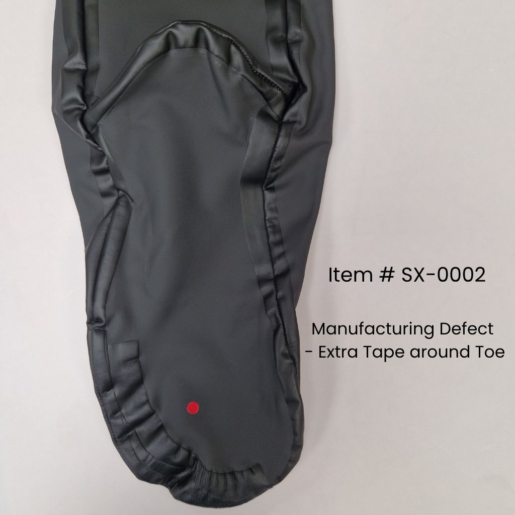SX-0007 Fabric Defect - defect on the outside waterproof coating of the fabric. Area of thinner outer coating that has been securely repaired by extra tape. Sole on right sock. Save >20%