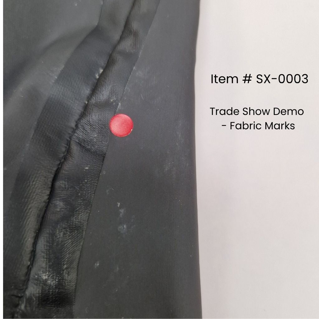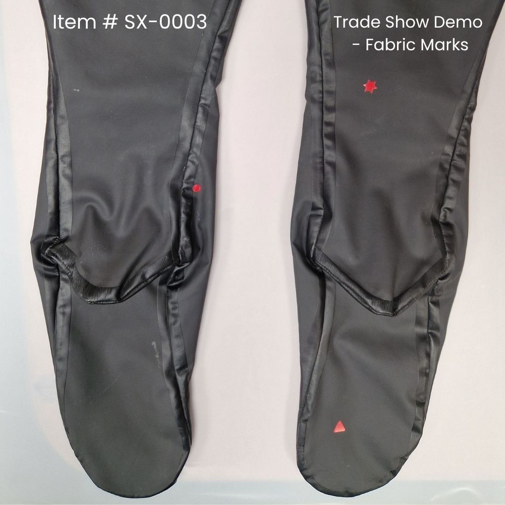 SX-0003 Demo Product - used as a sample at trade shows. There are a lot of marks on the fabric that we can't remove. They may have been tired on by customers at trade shows. Purely a cosmetic imperfection. The inside of the socks are clean. Save >25%