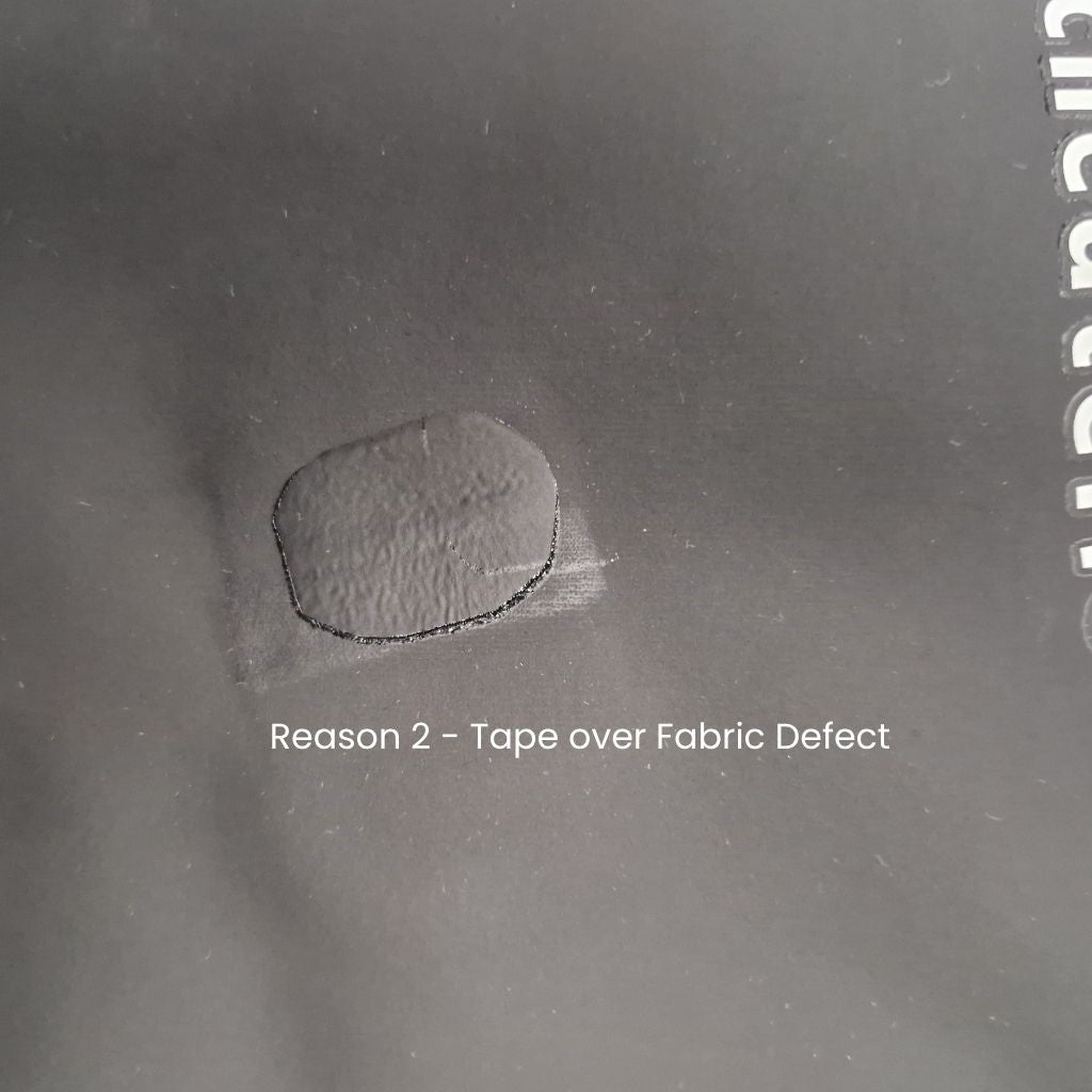 Reason 2 Fabric Defect - Defect on the outside waterproof coating of the fabric. Area of thinner outer coating that has been securely repaired by extra tape. Save >30%